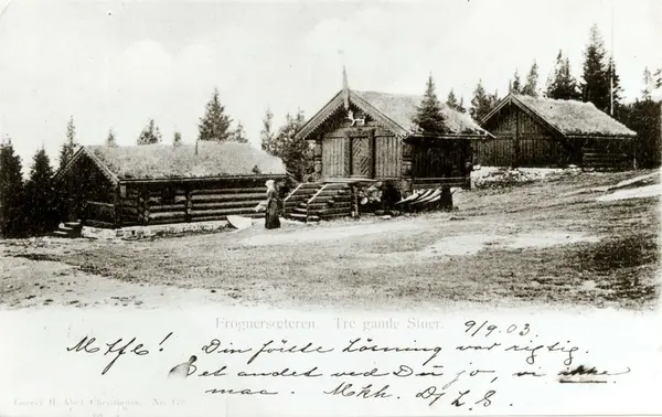 Frognerseteren, Oslo, Christiania. Kvinne ved seterhus. Foto av postkort med påskrift datert 09.09.1903.
