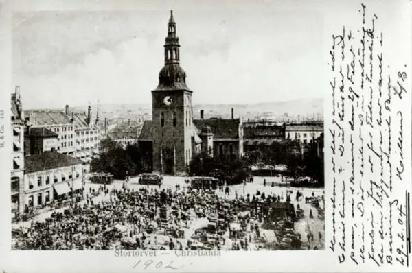 Stortorvet, Oslo. Sett ovenfra og mot Domkirken, livlig torghandel. Foto av postkort.