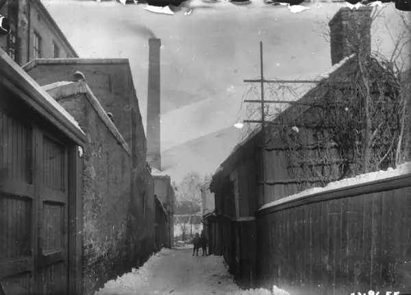 Smalgangen, Oslo. Tidligere gatestrimmel mellom Grønland og Breigata. Gateløp med sotpipe i bakgrunnen. Fra boliginspektør Nanna Brochs boligundersøkelser i Oslo 1920-årene.