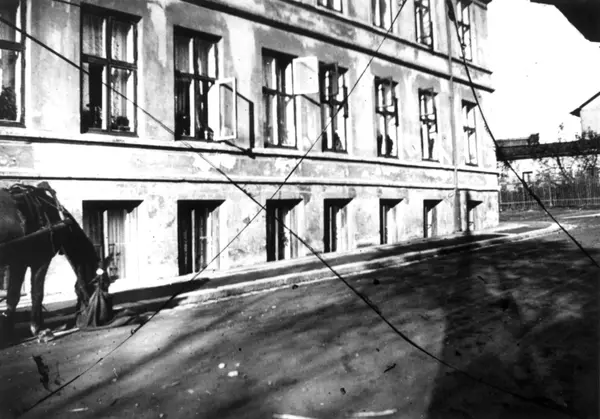Bygård, Oslo. I forgrunnen hest med mulepose. Fra boliginspektør Nanna Brochs boligundersøkelser i Oslo 1920-årene.