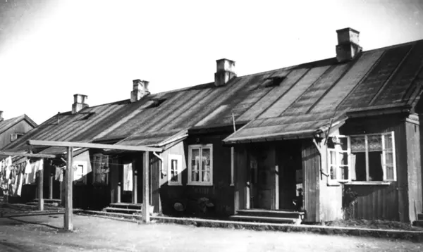 Arctanderbrakkene, Stavangergata, Bjølsen, Oslo. Boliger, bygget som midlertidige brakker. Klesvask hengt opp. Fra boliginspektør Nanna Brochs boligundersøkelser i Oslo 1920-årene.