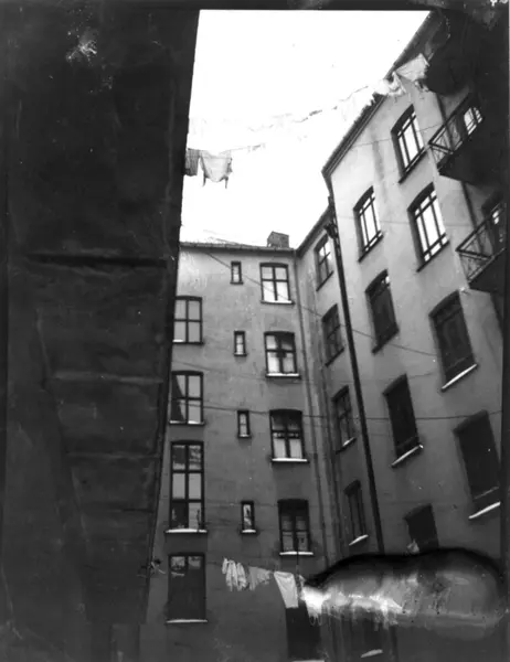 Gårdsrom, bygårder, Oslo. Klesvask opphengt. Fra boliginspektør Nanna Brochs boligundersøkelser i Oslo 1920-årene.