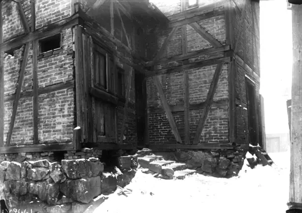 Husvegger i murt bindingsverk, muligens på Kampen, Oslo. Jfr. NF.13400-069. Fra boliginspektør Nanna Brochs boligundersøkelser i Oslo 1920-årene.