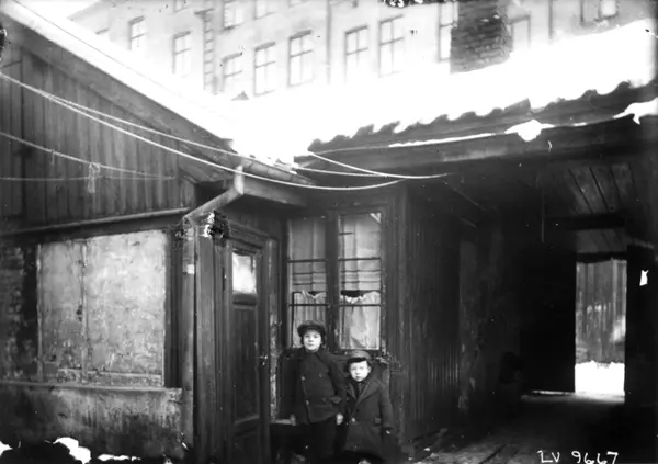 Gårdsrom, bolighus, lav trebebyggelse med høye murgårder i bakgrunnen. Barn poserer foran inngangsdør. Fra boliginspektør Nanna Brochs boligundersøkelser i Oslo 1920-årene.