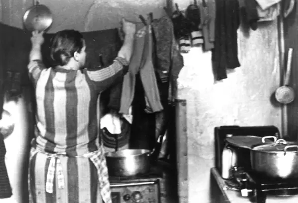 Interiør, kjøkken, Oslo. Kvinne henger opp tøy på snor over komfyr med gryter. Fra boliginspektør Nanna Brochs boligundersøkelser i Oslo 1920-årene.