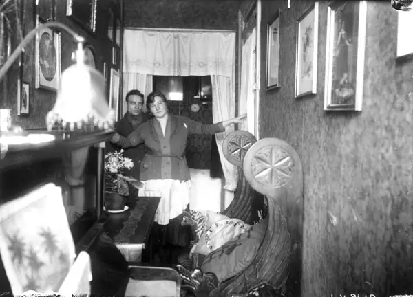 Interiør, ektepar i ettromsleilighet, ant. møblert gang, i Det Rivertzske kompleks, Sagene (bygget fra 1912 ved ark. Kristen T. Rivertz og "A/S Kristiania Byggeselskap for Småleiligheter"). Fra boliginspektør Nanna Brochs boligundersøkelser i Oslo 1920-årene.