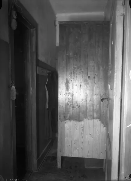 Interiør, bebodd entrè i Det Rivertzske kompleks, Sagene, Oslo (bygget fra 1912 ved ark. Kristen T. Rivertz og "A/S Kristiania Byggeselskap for Småleiligheter"). Vegg ant. satt opp for å dele rommet for å få soveplasser, se NF.13400-091 uten vegg. Fra boliginspektør Nanna Brochs boligundersøkelser i Oslo 1920-årene.