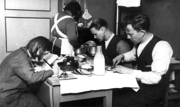 Interiør, kjøkken, Oslo. Matlaging, spising og lekselesing på liten plass. Fra boliginspektør Nanna Brochs boligundersøkelser i Oslo 1920-årene.