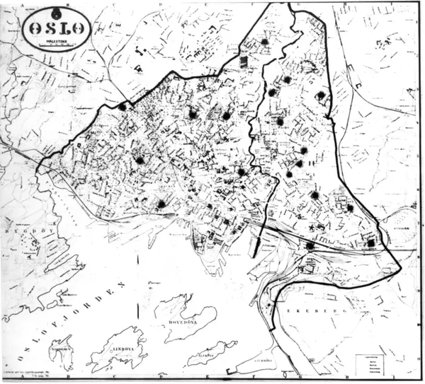 Tekstplansje. Oslokart. Fra lysbildeserie til utstilling på Østkantutstillingen 1934, "Den var vår, denne jord". Om tomteproblemer i Oslo. Fra boliginspektør Nanna Brochs boligundersøkelser i Oslo 1920-årene.