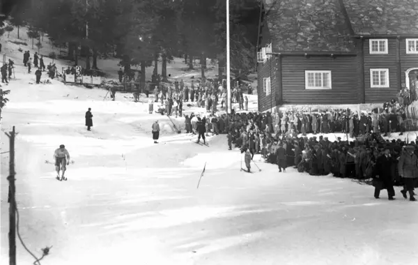 Skirenn i Holmenkollen i Oslo i 1934. Ved innkomsten av 50 km løypa ved Frognerseteren, antakelig. Publikum langs løypa.