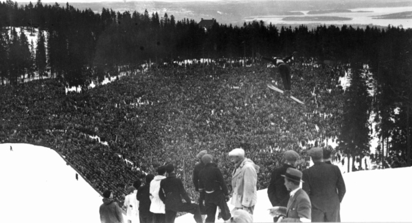 Ski. Hopprenn. Holmenkollen, Oslo 1934. Oversiktsbilde fra toppen av bakken ned mot sletta og publikum. Hopper i svevet. Tilskuere ses øverst i unnarennet. Oslofjorden skimtes i bakgrunnen.