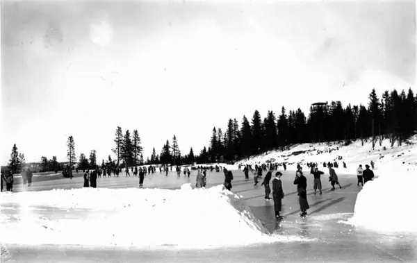 Tryvann skøytebane, Oslo. 1935. Skøyteløpere i sving på isen. Toppen av Tryvannstårnet ses i bakgrunnen.