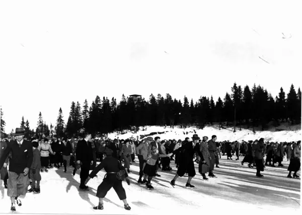 Tryvann skøytebane, Oslo. 1934. Tettpakket med skøyteløpere på isen. Toppen av Tryvannstårnet ses i bakgrunnen.
