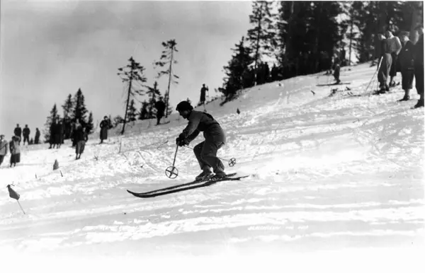 Slalåmrenn, Tryvannsåsen, Oslo 1934. En skiløper på vei ned løypa. Tilskuere på toppen av bakken.