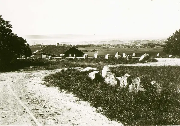 Utsikt over Oslo fra området ved Grefsen Bad. I forgrunnen vei som bukter seg nedover, med åpne marker før byen ses i det fjerne. Del av Brødrene Brunskows serie norske landskapsbilder.