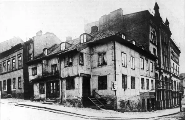 Gullsmedgården, hjørnet Prinsens gate og Nedre Slottsgate, Oslo, revet 1897. Utklipp fra bok. Hus i umuret bindingsverk, visstnok fra byens første byggeperiode. Utklipp fra trykksak.