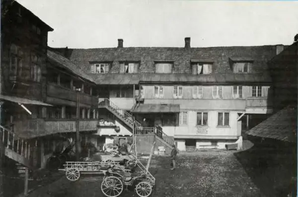 Storgata 4, Oslo. En typisk høkergård. Gårdsrom med hestekjerrer. Utklipp fra trykksak. Se billedtekst under andre opplysninger.