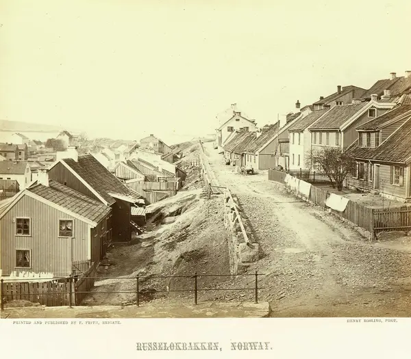 Ruseløkkbakken, Ruseløkka, Oslo. Gateløp med boligbebyggelse på begge sider. Fra serie norske landskapsfotografier tatt av den engelske fotografen Henry Rosling (1828-1911).