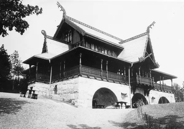 St. Hanshaugen, Oslo, eksteriør av restaurantanlegget Hasselbakken. Bygget 1890, tegnet av ark. Holm Munthe i dragestil. Grotter ble anlagt i fjellet under restauranten. Brente 1936. Del av Brødrene Brunskows serie norske landskapsbilder.