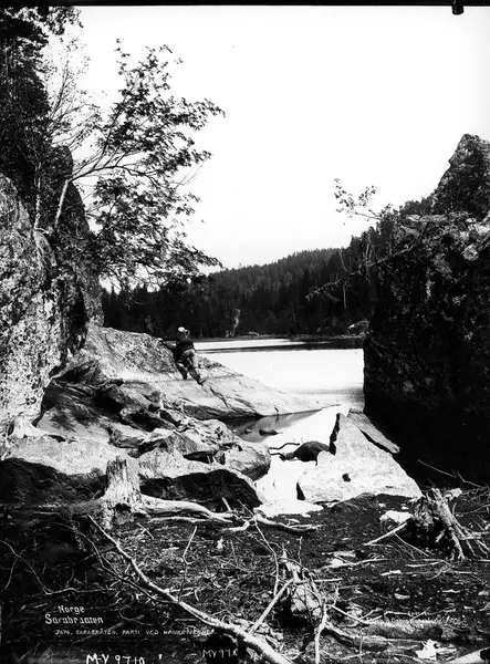 Landskap, utsikt til Hauketjernet, Sarabråten, mellom fjellknauser og småskog. Mann ligger på fjell med utsyn over vannet, ant. èn av fotografbrødrene Brunskow. Del av Den Norske Turistforenings samling landskapsbilder, de fleste tatt av fotografene Brødrene Brunskow.
