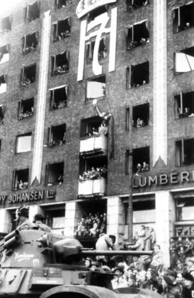 Fra Oslo 7. juni 1945. Kongen kommer tilbake.Publikum, står i gaten og i vinduer med flagg og venter spent. Soldater i tanks i forgrunnen, hus prydet med kongens monogram i bakgrunnen.