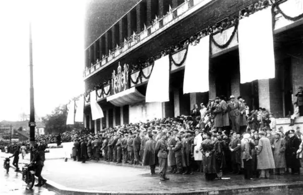 Fra Oslo 7. juni 1945 -Kongen kommer tilbake. Publikum står på Rådhustrappen og på balkonger oppover i etsajene og venter. Rådhuset er pyntet i anledningen. Militære og politiet holder vakt.