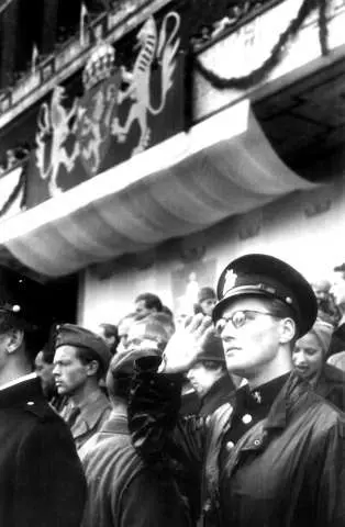 Fra Oslo 7. juni 1945 - Kongen kommer tilbake.Publikum, militære og politi venter spent foran Rådhuset som er pyntet med Norges Riksvåpen med Den norske løve.