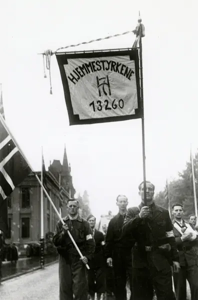 Fra fredsdagene i 1945. Fra Borgertoget. Hjemmestyrkene marsjerer på Karl Johans gate. Fane med kongens monogram og teksten HJEMMESTYRKENE og nummeret 13260.