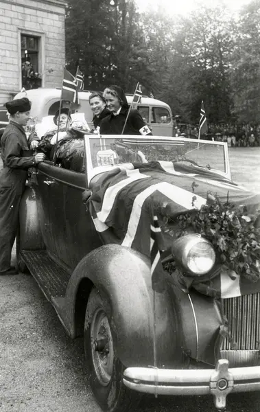 Fra fredsdagene i 1945, antagelig 17.mai. På Slottsplassen med en såret hjemmefrontkar liggende i bil, av typen Packard 1939, på båre med blomster i hendene. En uniformert mann og to kvinnelige sykelpeiere ved bilen, som er pyntet med løv og norske flagg.
