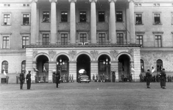 Fra fredsdagene i 1945. Kan være kronprins Olavs hjemkomst 13.mai. Uniformerte menn på Slottsplassen med Slottet i bakgrunnen. En bil kjører inn.