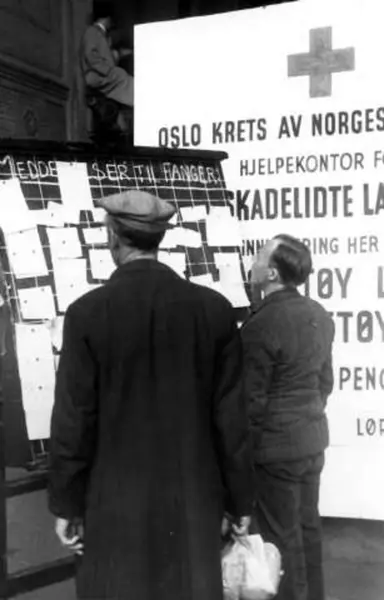 Fra Oslo under fredsdagene i 1945. Grinifangene ankommer Universitetet.To menn foran en oppslagstavle med meddelelser til de frigitte fangene. Bak et stort skilt for Røde Kors hjelpekontor.