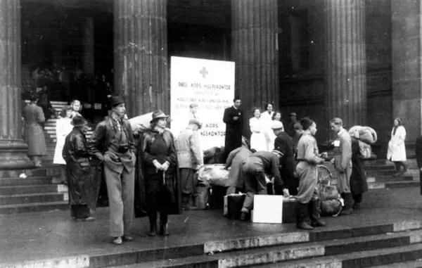 Fra Oslo under fredssdagene i 1945. Fra Universitetet i sentrum der Røde Kors hjelpekontor holdt til. Grinifanger samles her før hjemreise.