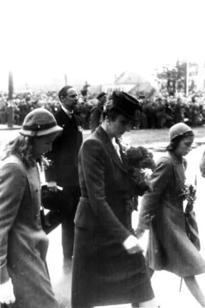 Fra Oslo under fredssdagene i 1945.7.juni Kongen kommer tilbake. Her foran Rådhuset. Kronprinsesse Märtha, Prinsesse Ragnhild og Prinsesse Astrid.