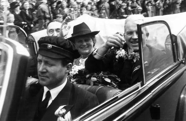 Fra Oslo under fredssdagene i 1945.Rektor Seip med frue i åpen bil med sjåfør. Publikum i bakgrunnen.