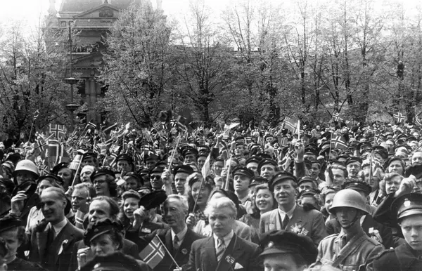 Fra Oslo under fredssdagene i 1945. Jublende mennesker med studentluer og flagg på Universitetsplassen. I bakgrunnen Nationaltheatret i bakgrunnen.