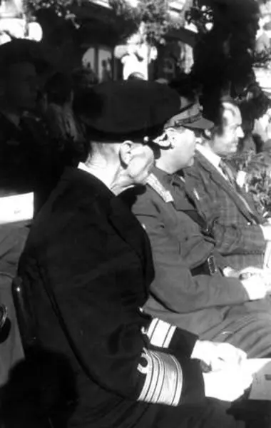 Fra Oslo under fredsdagene i 1945.Kong Haakon VII sittende ved siden av Kronprins Olav.