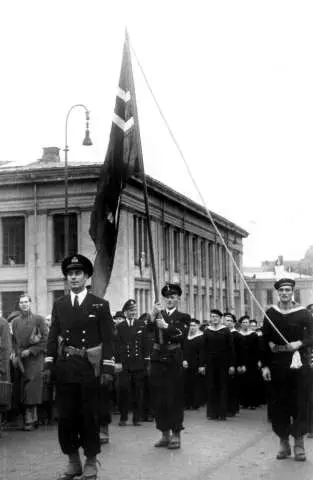 Fra Oslo under fredsdagene i 1945. Marinen marsjerer opp Karl Johans gate.Universitetet i bakgrunnen.