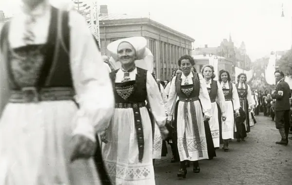 Fra Oslo under fredsdagene i 1945. Bunadskledde kvinner marsjerer oppover Karl Johans gate.