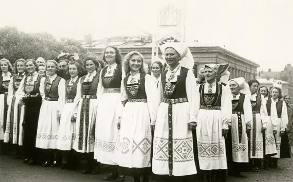 Fra Oslo under fredsdagene i 1945.Bunadskledde kvinner marsjerer oppover Karl Johans gate.