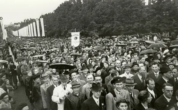 Fra Oslo under fredsdagene i 1945.Fra marsjen på Karl Johans gate. Mange bærer paraply.