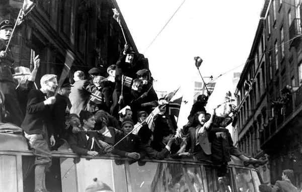 Fra Oslo under fredsdagene i 1945. Bil full av glade ungdommer i krysset Karl Johans gate og Rosenkranz gate
