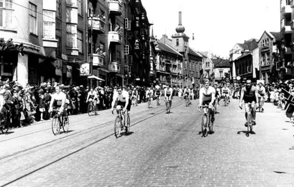 Fra Oslo under fredsdagene i 1945. Idrettens Dag på Bislett Stadion 3. juni. Syklister og publikum i Ullevålsveien i Oslo