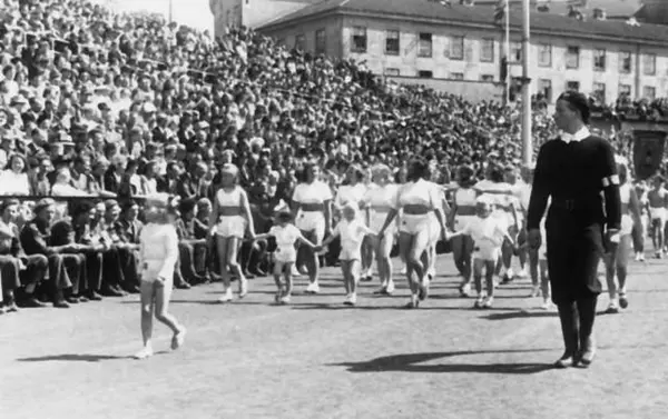 Fra Oslo under fredsdagene i 1945. Idrettens Dag på Bislett Stadion 3.juni. Idrettskvinner og barn marsjerer på den oppmerkede banen.