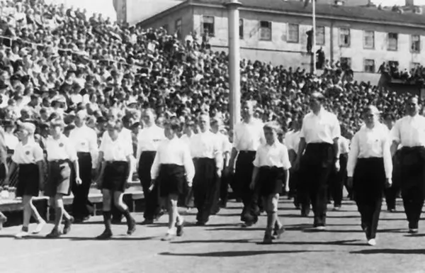 Fra Oslo under fredsdagene i 1945. Idrettens Dag på Bislett Stadion 3.juni. Gutter og menn marsjerer på de oppmerkede feltene.