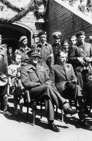 Fra Oslo under fredsdagene i 1945. Idrettens Dag på Bislett Stadion 3.juni. fra tribunen med blandt annet Kronprins Olav.