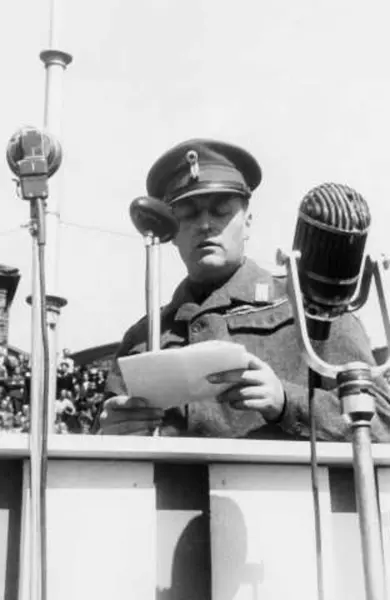 Fra Oslo under fredsdagene i 1945. Idrettens Dag på Bislett Stadion 3.juni. Kronprins Olav holder tale.