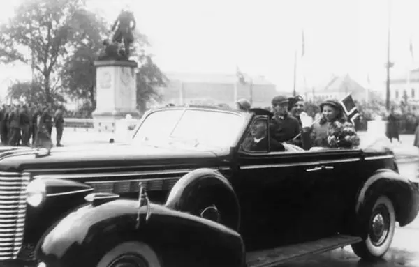 Fra Oslo 7. juni 1945. Kongen kommer tilbake.Her kommer bilen, A2, med Kronprins Olav, prinsen og prinsessene.
