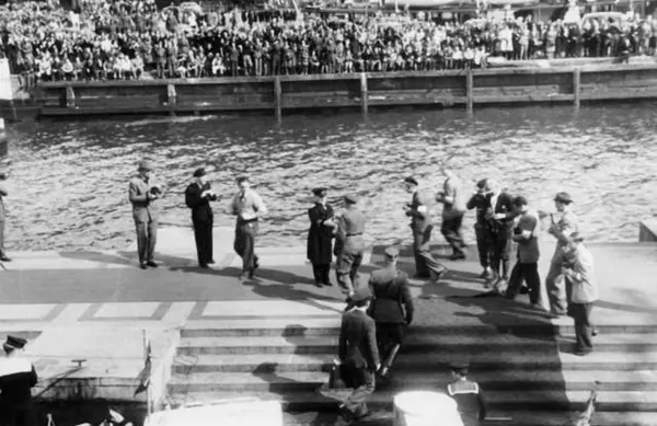 Fra Oslo under fredsdagene i 1945. Den 13.mai kommer Kronprins Olav tilbake.Her stiger han i land på Honnørbrygga klokken 16.30, i spissen for befal fra Forsvarets Overkommando, og hilser på havnerådmann Kjellstrup. Begivenheten blir behørlig fotografert.