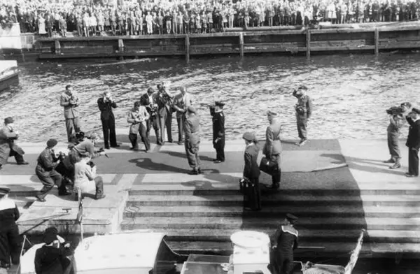 Fra Oslo under fredsdagene i 1945. Den 13.mai kommer Kronprins Olav tilbake.Her står han inne på Honnørbrygga sammen med havnerådmann Kjellstrup.Pressekorpset fotograferer begivenheten.
