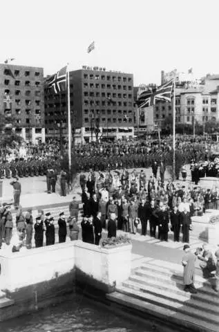 Fra Oslo under fredsdagene i 1945. Den 13.mai kommer Kronprins Olav tilbake. Bildet viser mottagelsen på Hønnørbrygga, og Rådhusplassen med publikum, fotografer,hjemmefrontkarer og politisoldater.